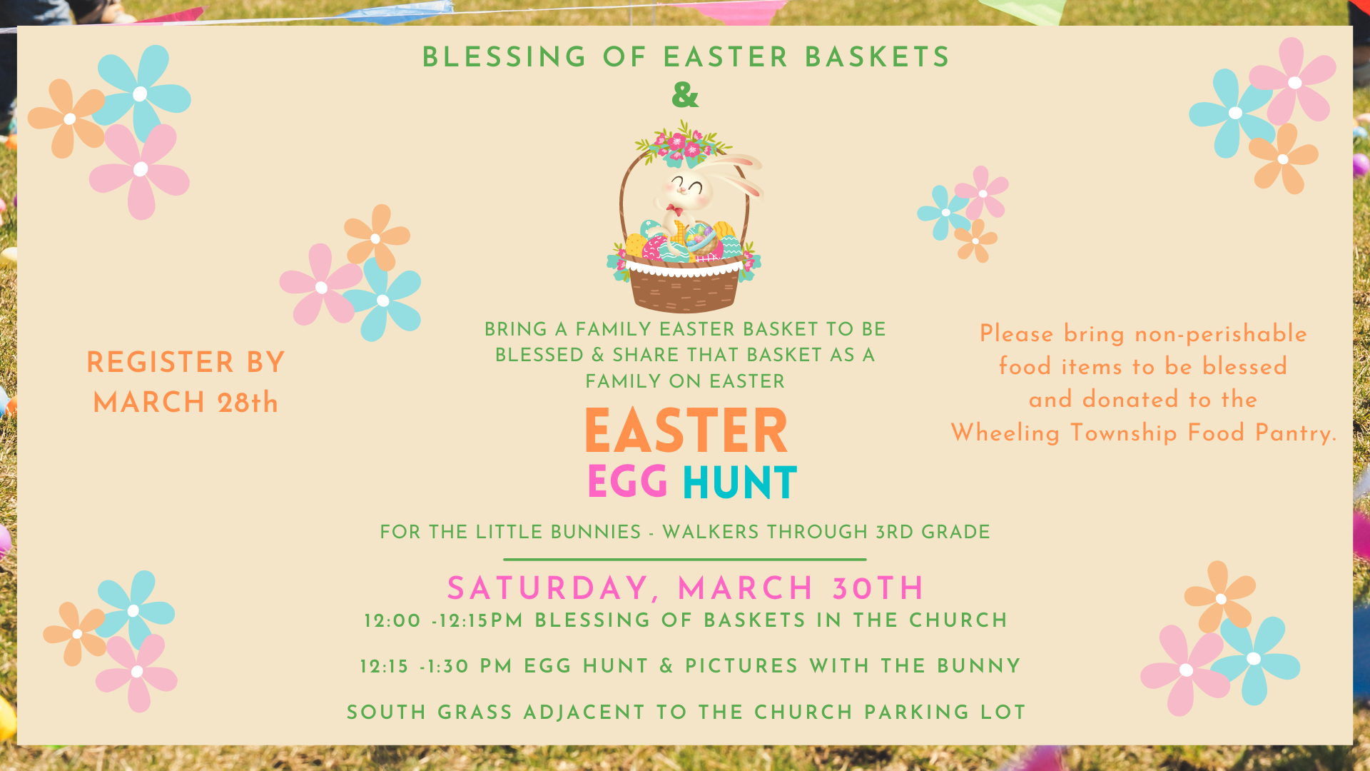 Join us to have your family Easter basket blessed, and share that basket as a family on Easter. Also, bring non-perishable food items to be blessed and donated to the Wheeling Township Food Pantry.