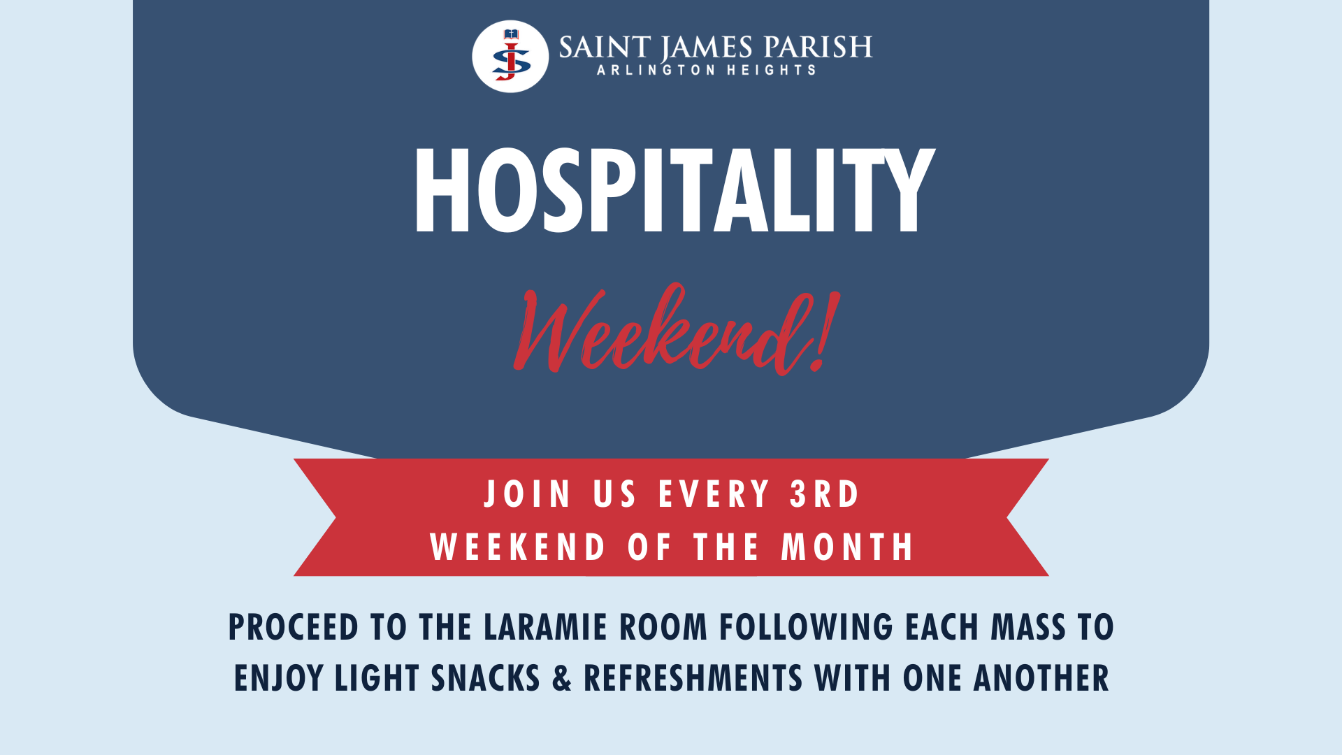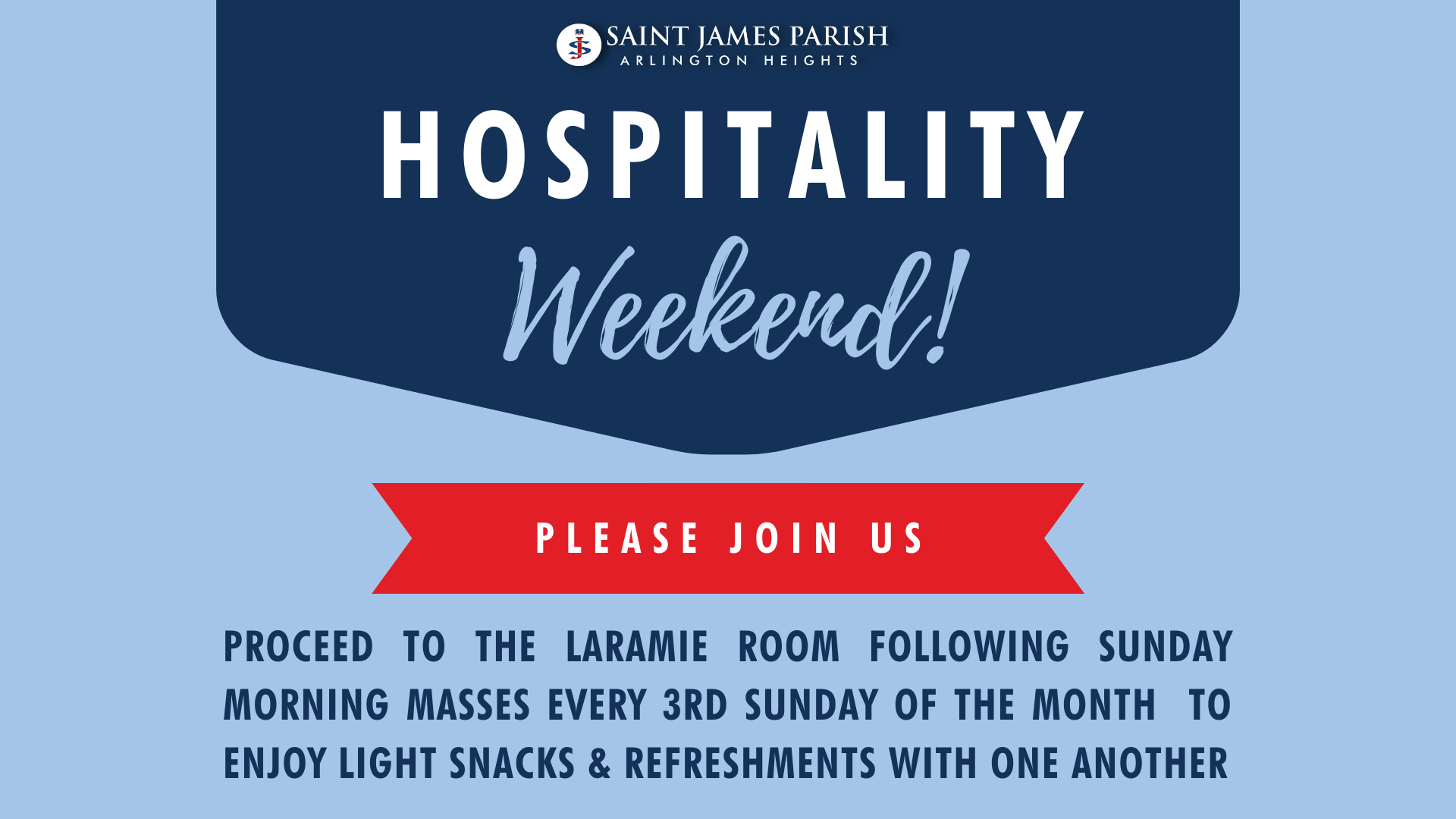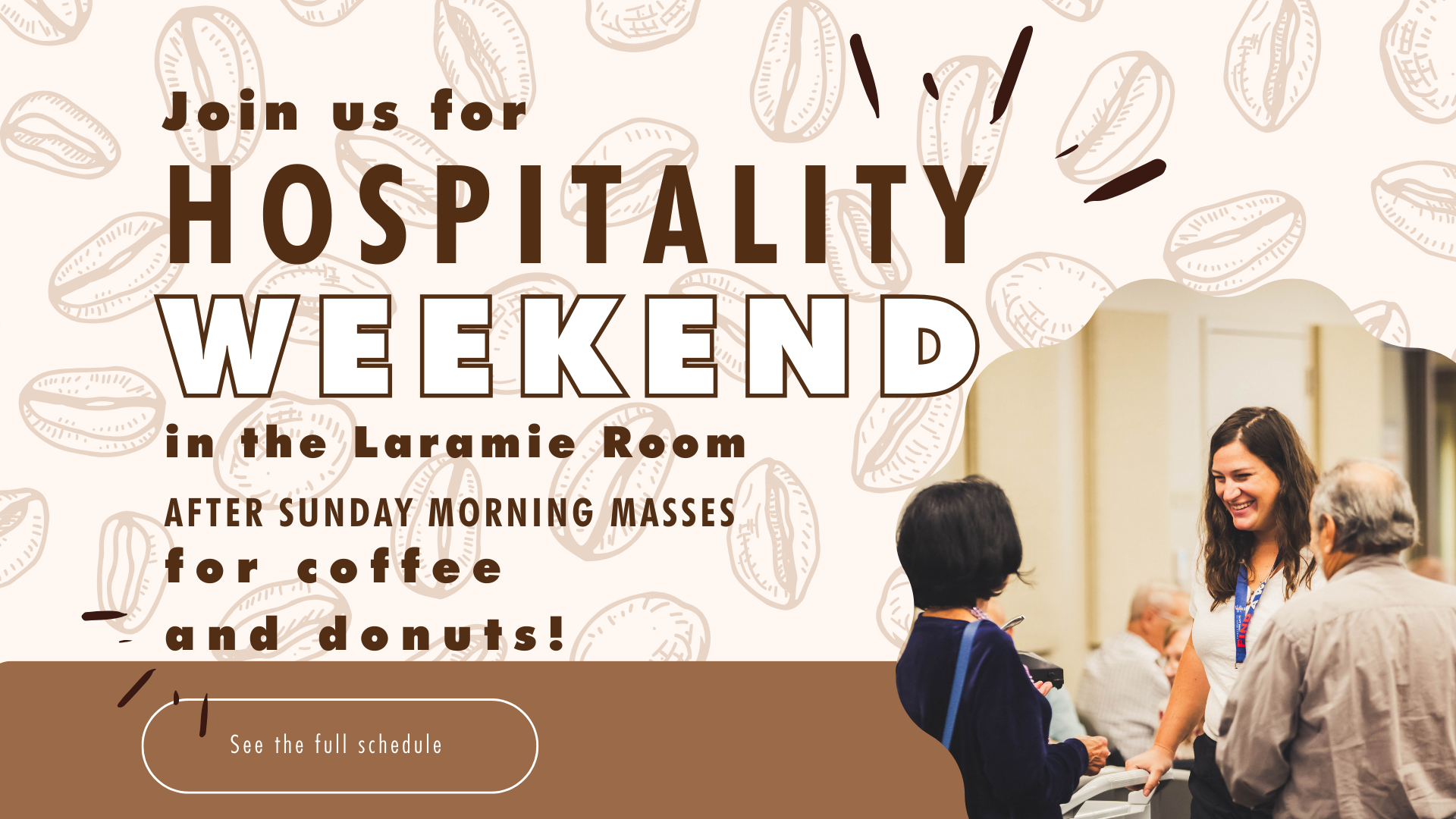 Hospitality Weekend Join us every 3rd weekend of the month after each Sunday morning mass in the Laramie room to grow in relationship with your fellow parishioners over a cup of coffee and a donut. Hospitality Weekend 2025 Schedule: January19February16March16May18June15July20August17September21October19November16December21