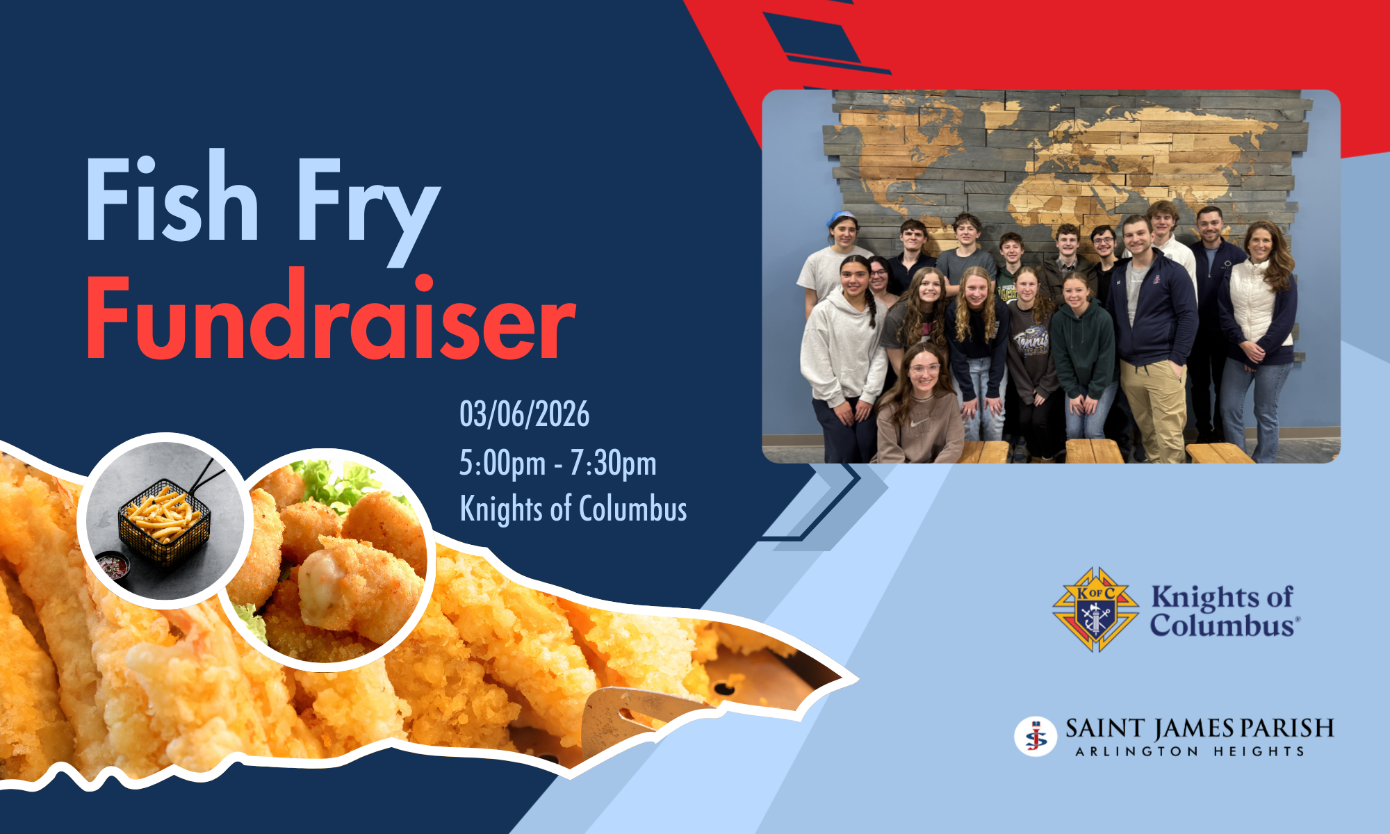 As we enter the season of Lent, we invite the entire parish to join us at the Knights of Columbus Fish Fry on Friday, March 6. We will be partnering with the Knights of Holy Rosary Council to enjoy their delicious fish and chips, with a portion of the proceeds benefiting St. James Parish.