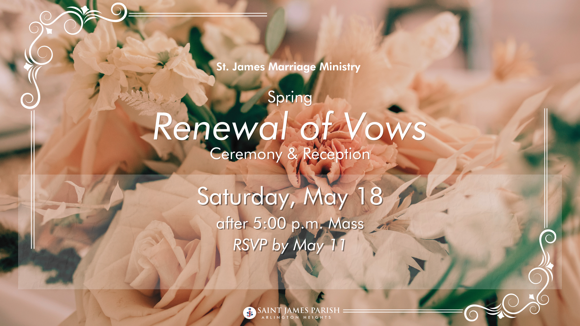 The St. James Marriage Ministry invites all married couples to renew their vows together. The brief ceremony in church will be immediately followed by a reception featuring light refreshments and cake. Dance to music by the Johhny Burnett Band. Please RSVP below so we know how many to expect for the reception. Bring your wedding photo to share.