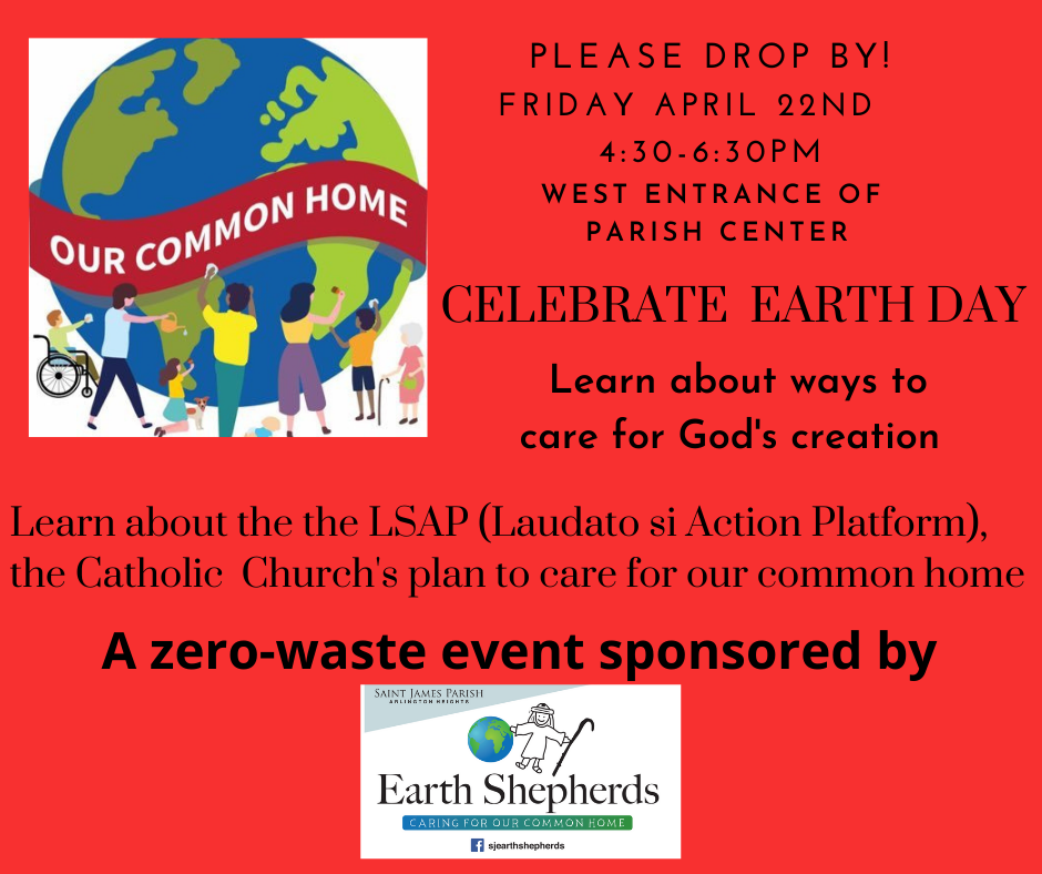 St. James Earth Shepherds is passionate about stewarding of God’s Creation, supporting individual and parish-wide efforts to live more sustainably, and coordinating initiatives to care for the environment. Parishioners of all ages are welcome. Contact Bonne Cimo to learn more and get involved.